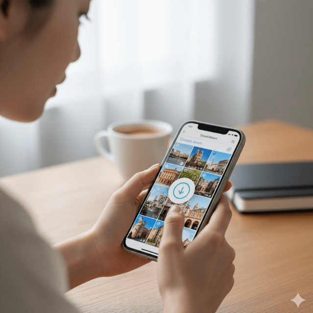 操作は簡単で、アプリまたはWebサイトでダウンロードしたい写真を開くか、一覧画面で長押しして選択状態にします。その後、メニューから「ダウンロード」を選択するだけです。