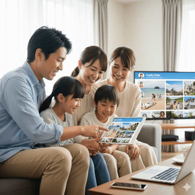 家族旅行や子供の成長記録など、家族全員で共有したい写真を「ファミリーフォルダ」にアップロードしておけば、全員がいつでも自分のデバイスから閲覧・ダウンロードできます。各自が撮影した写真を一箇所に集約するのにも非常に役立ちます。