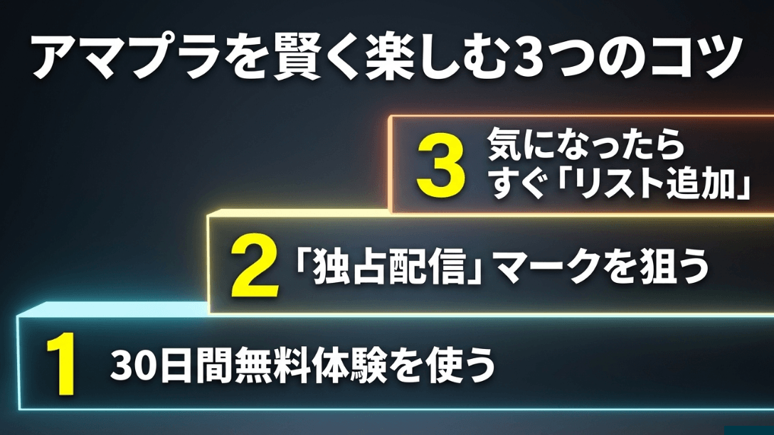 - 独占配信マークをチェック: 青い帯で「Prime」と書かれている作品は追加料金なしで視聴可能。
