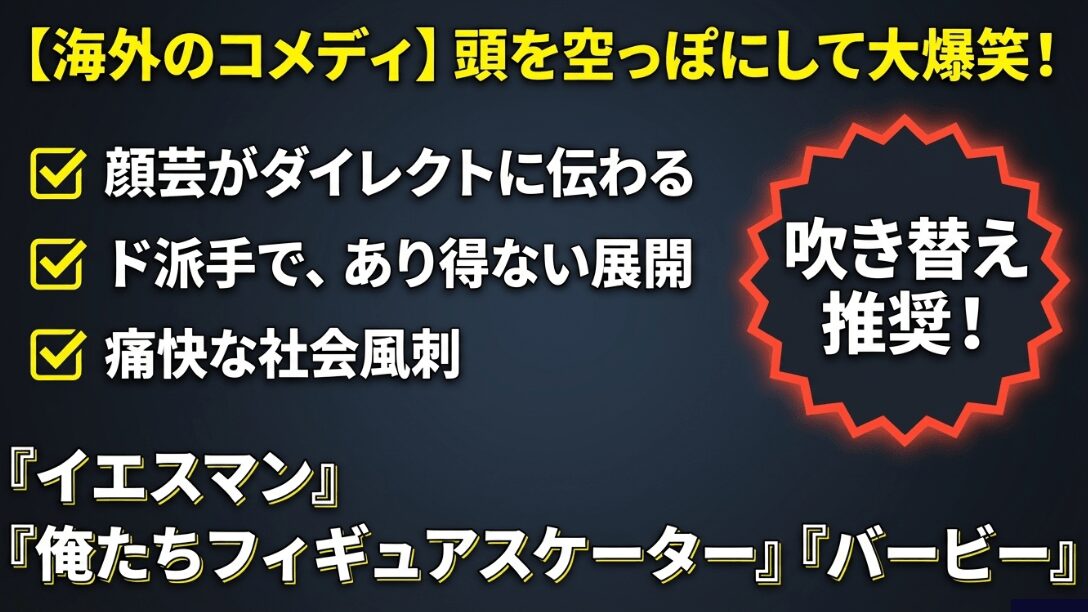 例えば『イエスマン “YES”は人生のパスワード』は、ジム・キャリー演じる主人公が、すべてに「イエス」と答えることで人生を激変させていく物語ですが、吹き替え声優さんの熱演によるテンポの良い掛け合いはまさに爆笑必至!言葉の意味を超えて、その「空気感」だけで笑えてしまうんです。