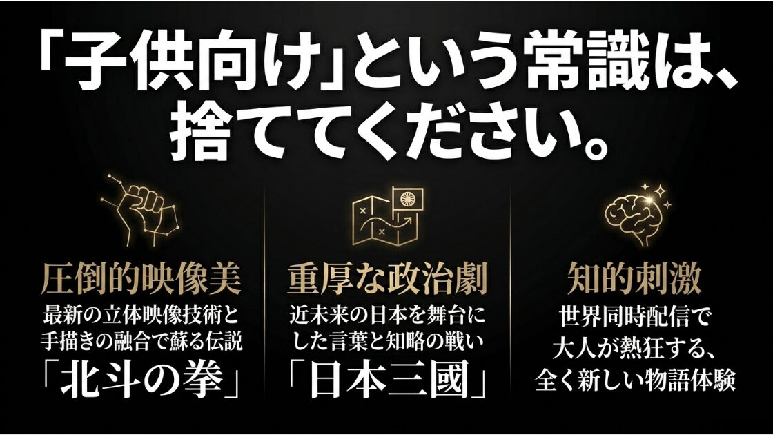 これまでは子供向けやティーン向けが中心だったアニメ市場ですが、アマプラが『日本三國』のような政治劇を独占的、かつ最速で提供することで、知的刺激を求める大人の視聴者をがっちりと掴んでいます。
