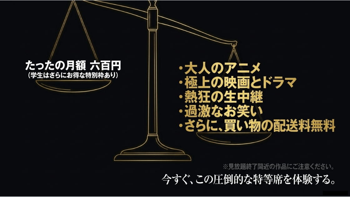 月額600円(または年額5,900円)という価格で、これほど多くのアマプラでしか見れない作品にアクセスでき、さらにはAmazonの配送特典や音楽配信まで享受できる。これ以上のコストパフォーマンスを誇るサービスは、他に見当たらないのではないでしょうか。