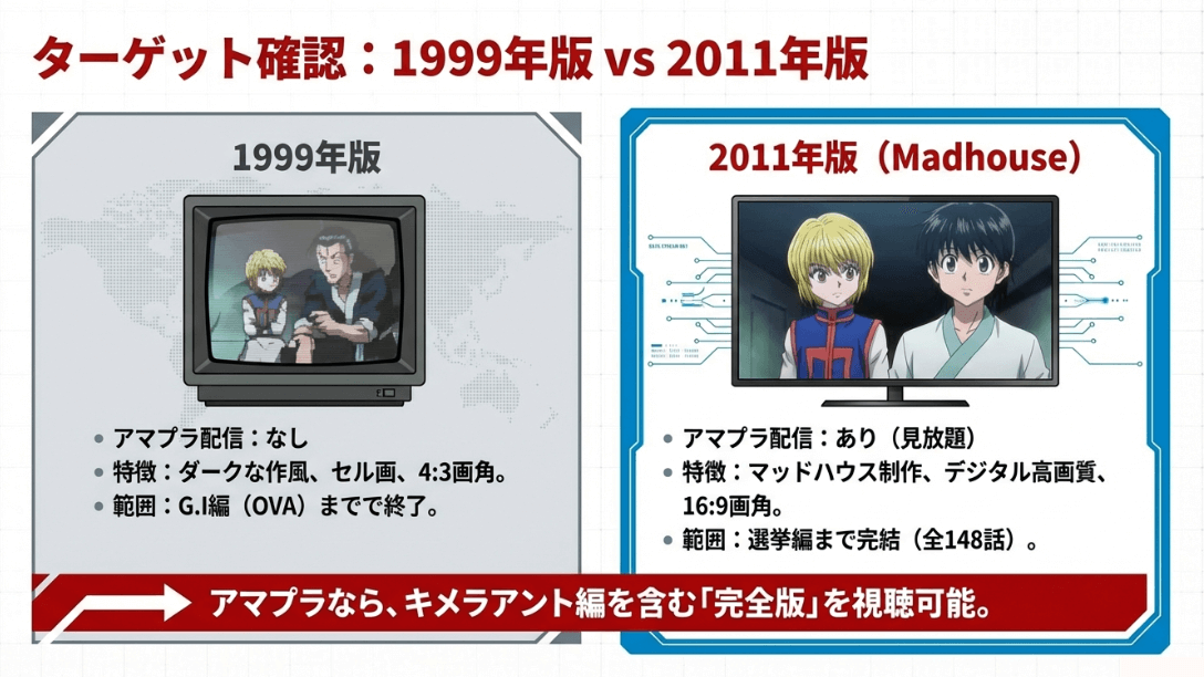 ハンターハンターを語る上で避けて通れないのが「新旧アニメ」の比較論争です。Amazonプライムビデオで現在、主流として配信されているのは、2011年から2014年にかけて日本テレビ系列で放送された「2011年版(マッドハウス制作)」です。