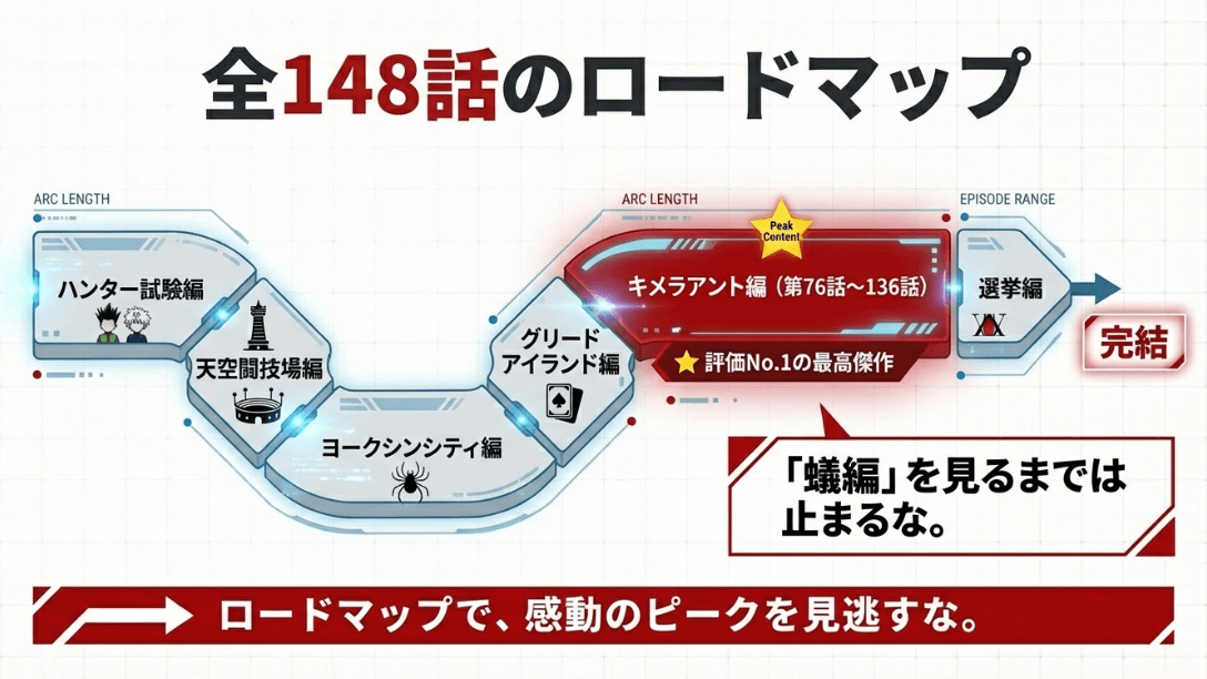 もし時間がなくて「とても全話は見られない」という方には、第37話からのヨークシン編と、第76話からのキメラアント編の2つを特に強くプッシュします。この2つのエピソードさえ押さえておけば、ハンターハンターの真骨頂である「極限の心理戦」と「命がけのバトル」を十分に堪能できるはずです。