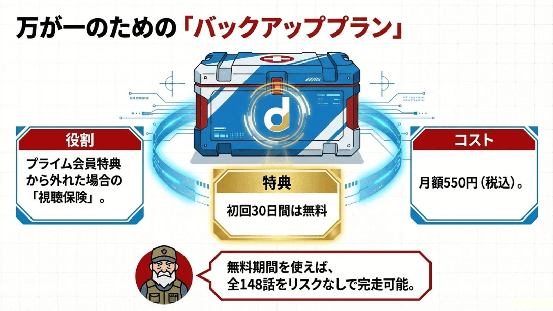 今後もしプライム特典から外れてしまった場合は、dアニメストアチャンネルの30日間無料体験という「最強のバックアップ」があることを忘れないでください。これを使えば焦って全話をレンタル課金する必要はありません。