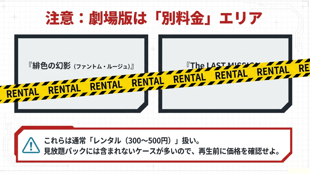 テレビシリーズ全148話を完走した、あるいは視聴中の息抜きとして気になるのが、2つの劇場版作品『緋色の幻影(ファントム・ルージュ)』と『The LAST MISSION(ザ・ラスト・ミッション)』です。
