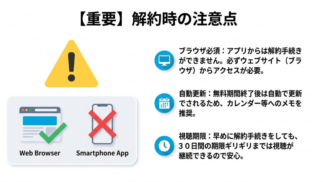 サービスを便利に使いつつも、いざという時の「出口」をしっかり把握しておくことは、誠実なユーザーとして非常に重要です。無料体験を始めたものの、解約の仕方が分からず意図しない請求が来てしまった…というトラブルは意外と多く耳にします。