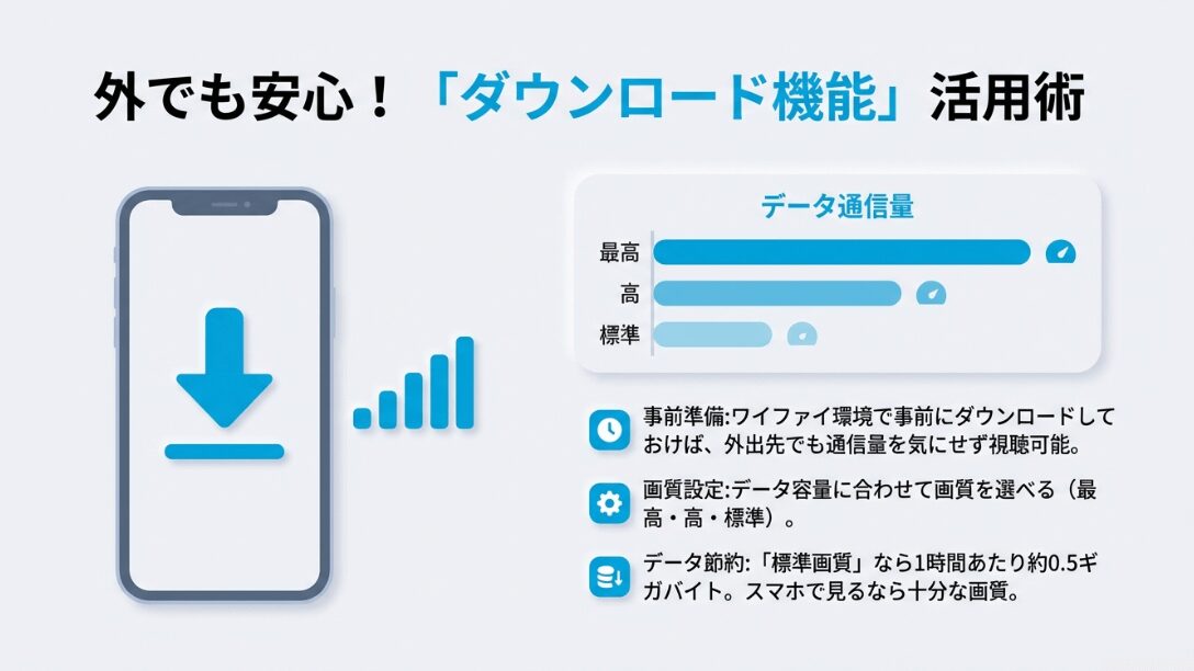 そこで、自宅のWi-Fi環境であらかじめ数話分をダウンロードしておくことをおすすめします。ダウンロードさえ完了していれば、電波の届かない地下鉄の中や飛行機内でも途切れることなく視聴が可能です。