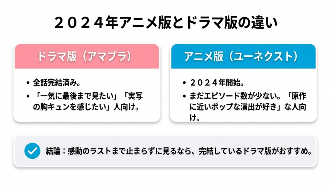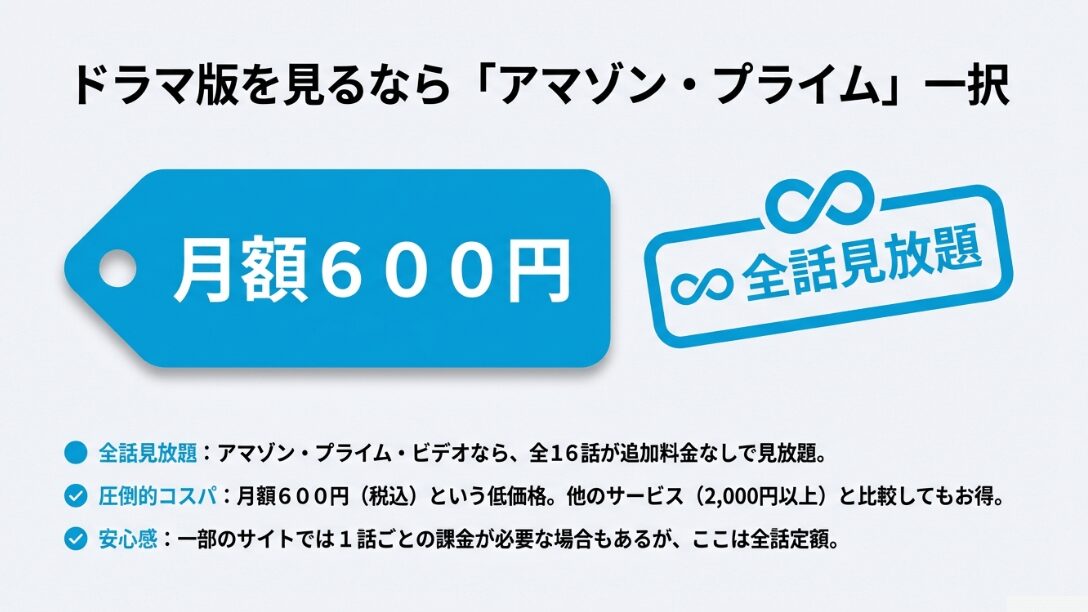 ここで注意したいのが、ドラマ版とアニメ版では配信されているプラットフォームに明確な違いがあるという点です。今回の調査時点では、ドラマ版がアマプラで見放題配信の主力となっている一方、アニメ版に関してはU-NEXTが戦略的な独占先行配信権を行使しています。