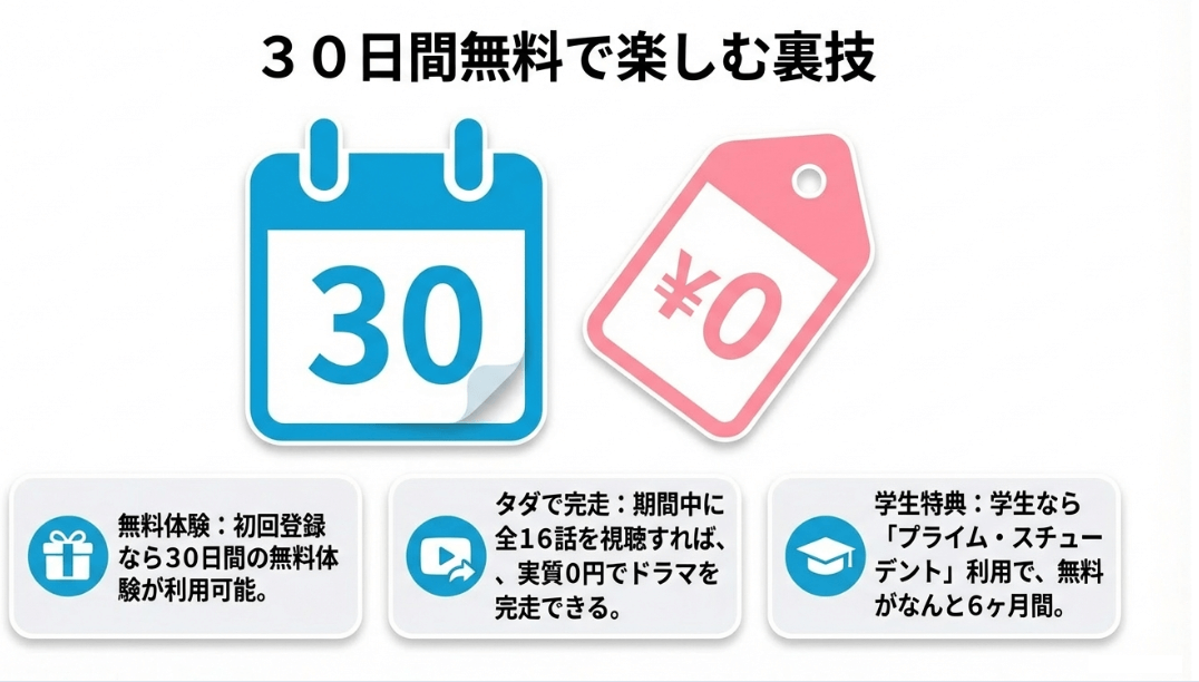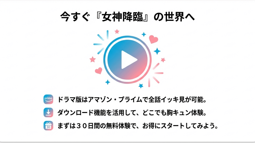 「女神降臨は見たいけど、月額料金を払うのは…」という方に最もおすすめなのが、Amazonプライムの30日間無料体験を活用する方法です。この制度を利用すれば、期間中であれば一切の追加料金なしでドラマ版を全話視聴することが可能です。