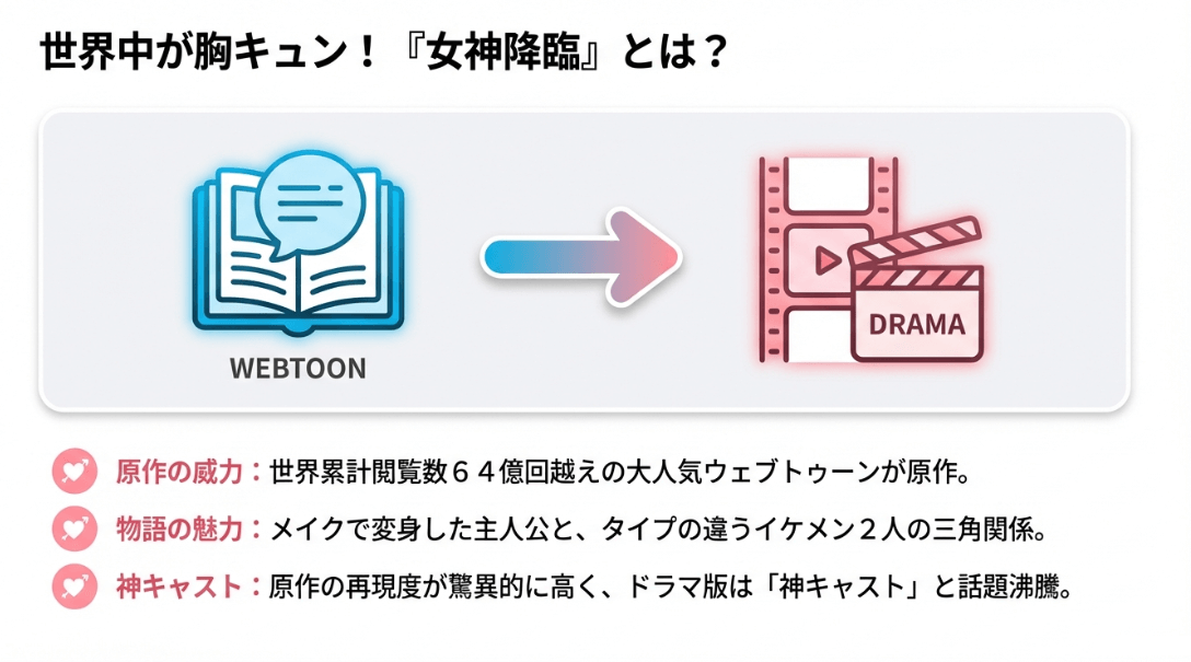女神降臨は、もともと韓国のWebtoon(LINEマンガ)で連載され、驚異的な閲覧数を記録した人気マンガが原作です。作者のヤオンイ先生が描く圧倒的な美学と、外見に強いコンプレックスを持つ主人公イ・ジュギョンの成長物語は、瞬く間に世界中の読者を虜にしました。