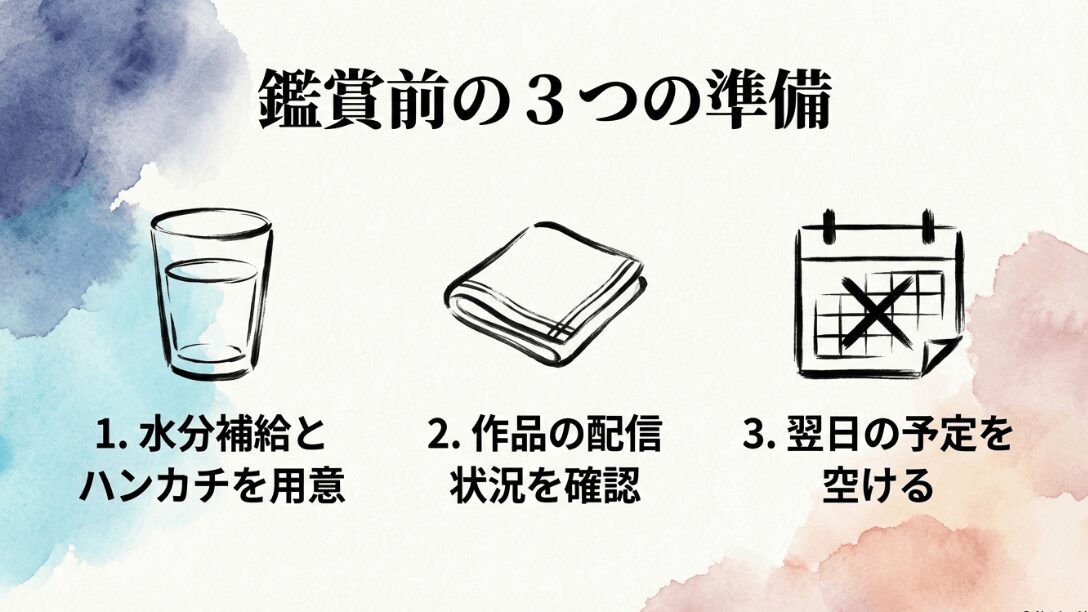 鑑賞前に準備すべき3つのポイント。水分とハンカチの用意、配信状況の確認、翌日の予定を空けることの図解スライド。