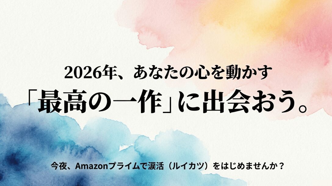 2026年、あなたの心を動かす最高の一作に出会おう。今夜からアマプラで涙活(ルイカツ)を始めようというメッセージスライド。