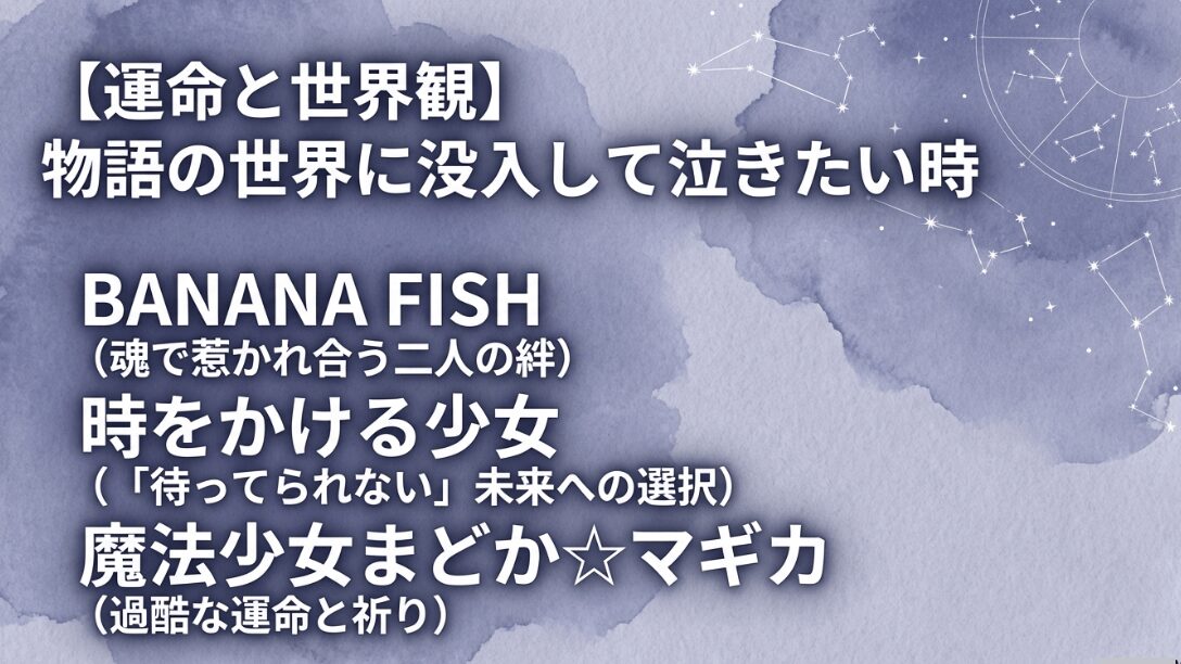 独特の世界観に浸れる作品として、BANANA FISH、時をかける少女、魔法少女まどか☆マギカを紹介するスライド。