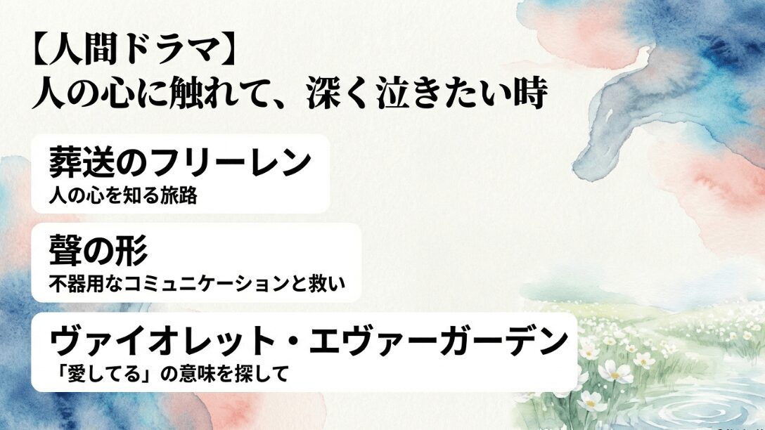 人の心に触れて深く泣きたい時におすすめの作品として、葬送のフリーレン、聲の形、ヴァイオレット・エヴァーガーデンを紹介するスライド。