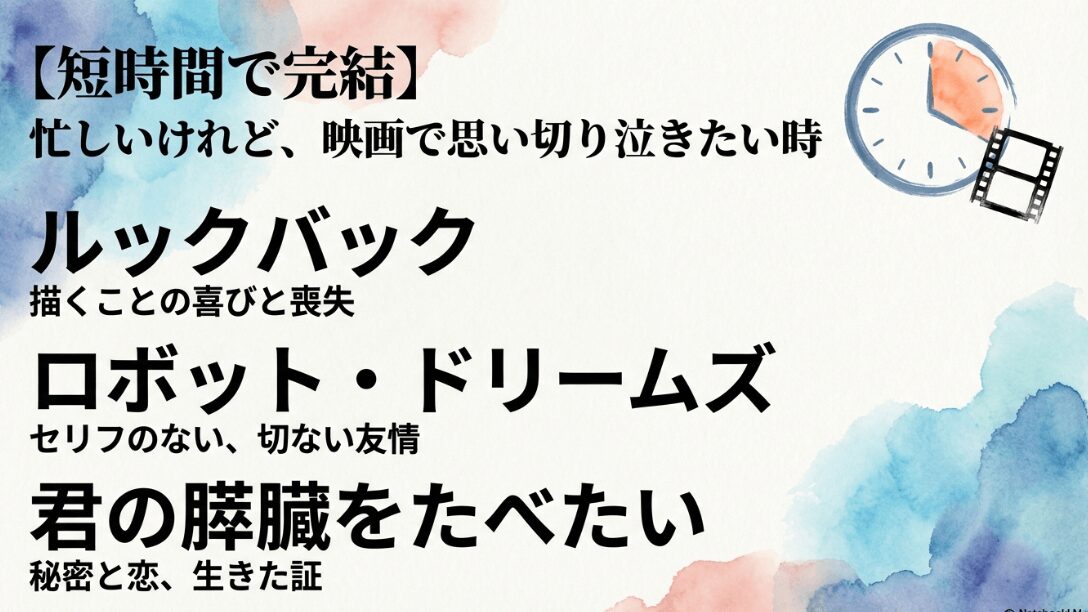 映画で完結するおすすめ作品として、ルックバック、ロボット・ドリームズ、君の膵臓をたべたいを紹介するスライド。