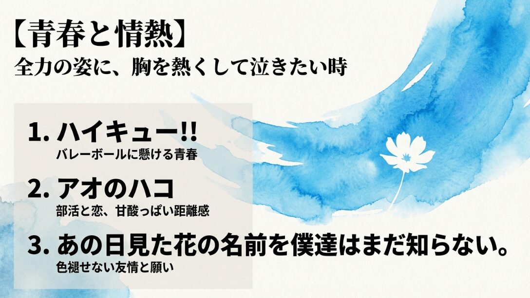 全力の姿に感動する作品として、ハイキュー!!、アオのハコ、あの日見た花の名前を僕達はまだ知らない。を紹介するスライド。